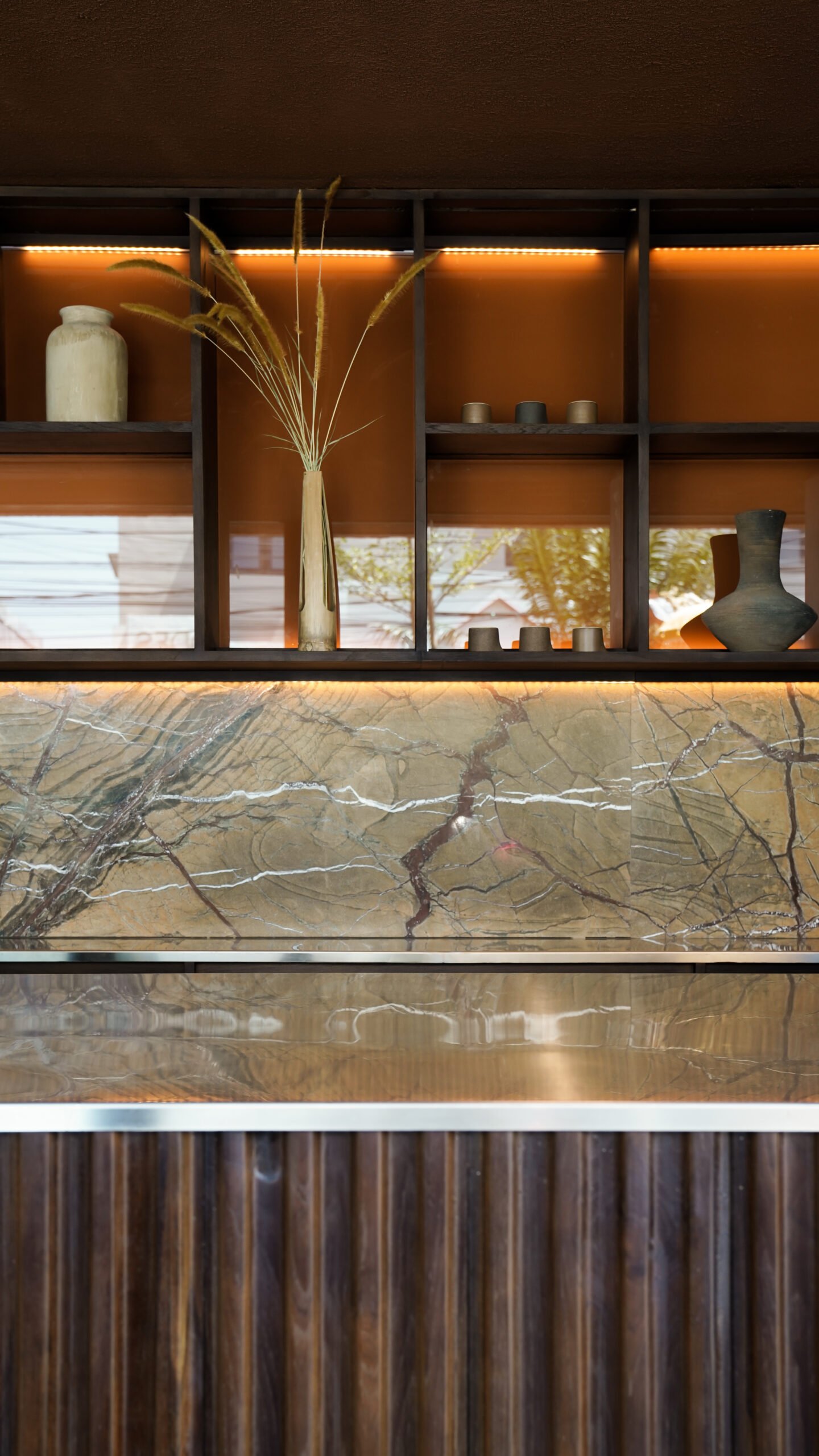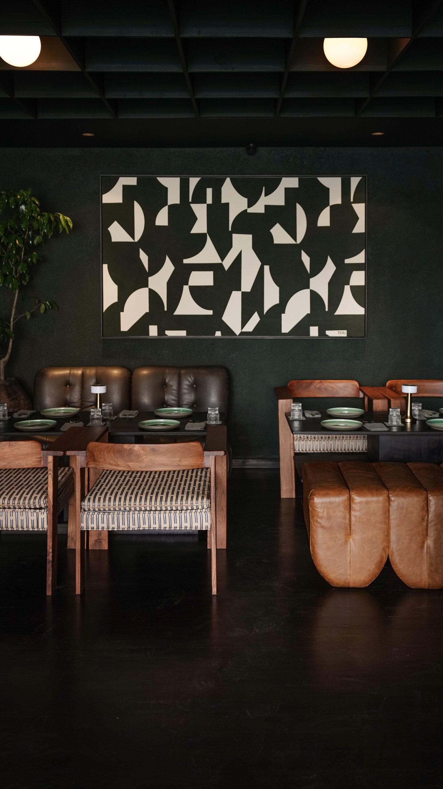 Details are where Muda truly shines. The hand-carved solid wood base tables with travertine tops whisper of craftsmanship, while the intricately carved sofa legs add a bespoke touch to the intimate seating arrangements. Vibrant floral-patterned and boldly upholstered club chairs bring a playful energy, balancing the natural materials with pops of personality. Commissioned artwork by Teru Studio adds an additional layer of vibrancy, infusing the space with life and character. The pièce de résistance, however, is the bar, a striking centerpiece where variegated onyx meets fluted wood panels, creating a theatrical yet inviting atmosphere.