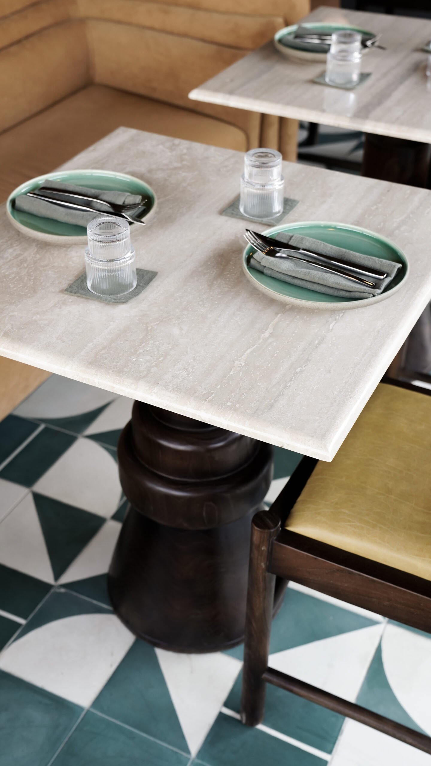 As the evening unfolds, the second floor transforms into an intimate cocktail lounge, offering a different kind of experience. Here, the mood shifts to something darker and more sensual. Oversized leather club chairs paired with suede create an irresistible sense of texture and comfort, while deep green hues and geometric patterns evoke a modern yet timeless allure. The dramatic travertine dining tables anchor the space, perfectly suited for the artisanal cocktails that take center stage.